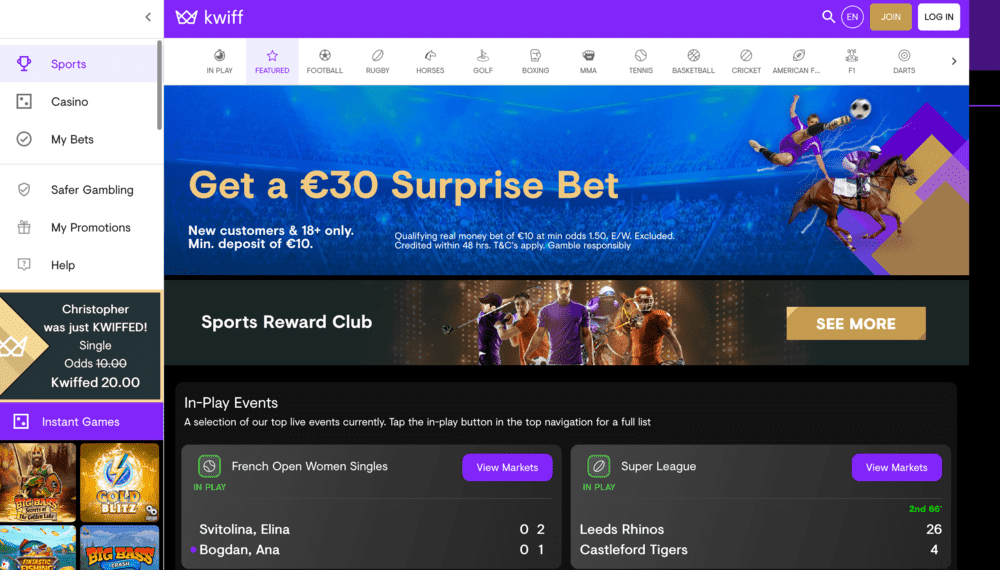 Kwiff is new to the Irish market yet has grown in size considerably thanks to their excellent selection of odds on sporting markets. While the 16 sports they cover doesn’t match the likes of BoyleSport’s 42, their odds on those 16 sports are very competitive.